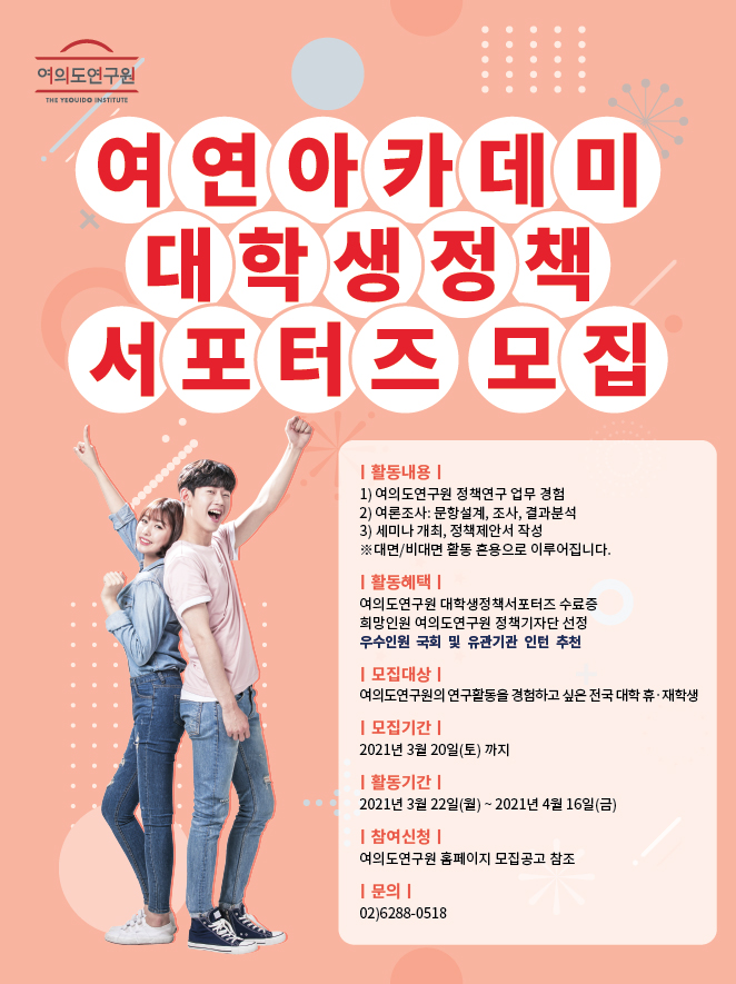 여의도연구원 아카데미에서 대학생정책서포터즈를 모집합니다.
