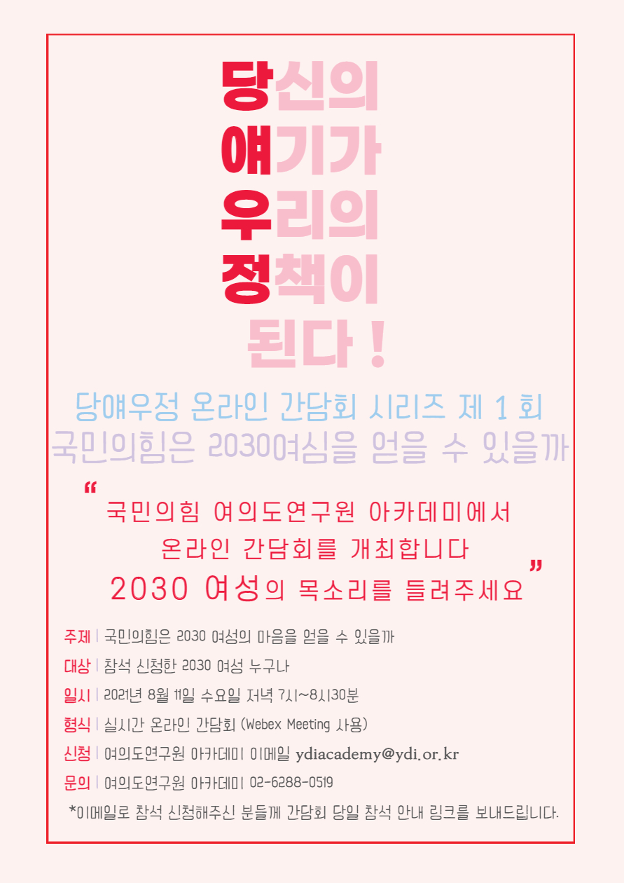 “국민의힘 여의도연구원 아카데미에서 온라인 간담회를 개최합니다. 2030 여성의 목소리를 들려주세요.”